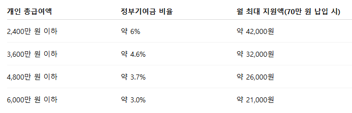 정부기여금: 소득 수준에 따라 월 납입액 일부를 추가 적립(약 1~3%)