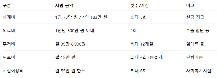긴급복지 생계지원은 단순히 한 번의 생계비 지급이 아니라, 생활 전반에 걸쳐 다양한 항목을 지원합니다.