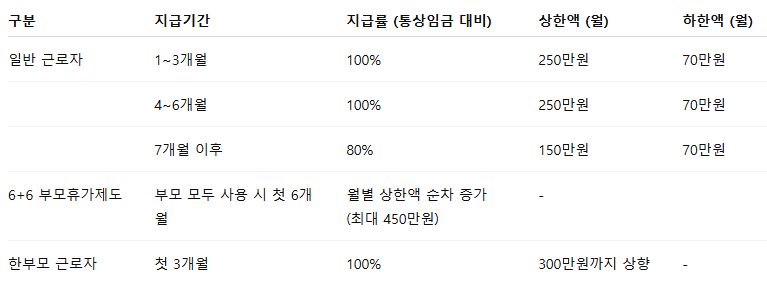 급여: 통상임금 100% (첫 6개월) / 이후 80%, 월 최대 250만원