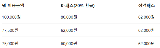 반대로 5~7만 원 이하 사용자의 경우에는 K-패스 환급 방식이 더 유리합니다.