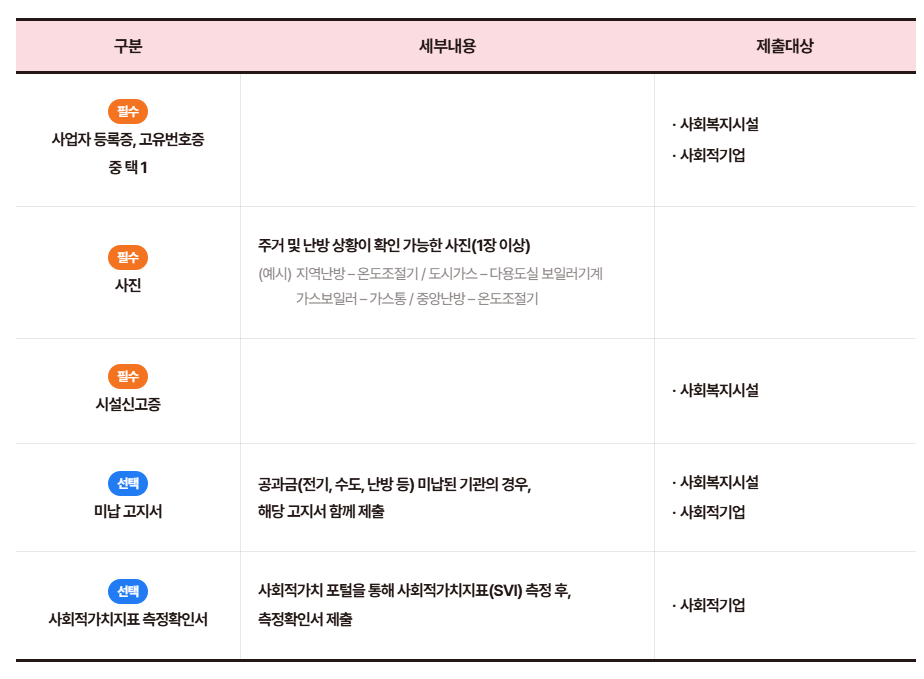 사회복지시설 및 사회적기업의 경우, 사업자등록증 또는 고유번호증, 시설신고증(시설만 해당), 미납 공과금 고지서(선택), 사회적가치지표(SVI) 측정확인서(선택) 등이 추가됩니다.